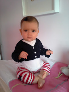 Sabem? A nossa bebe já tem 6 meses. Sua mãe vai trabalhar, vai, mas contrariada. Seu pai, fica sózinho com ela, a desfrutar da sua bebe. Que saudades que a mãe vai ter... Está já muito crescida. Começa até a saber fazer gracinhas. Reparem no tamanho deste casaquinho. Esta uma grandona linda